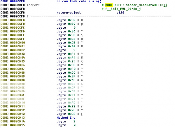 First, I use ida to reverse the encrypted dex file. In order to check whether there are changes happened on the bytecode of "a" in selected classes, I use "cn.com.fmsh.cube.a.a.a(" to find the function entry in IDA.